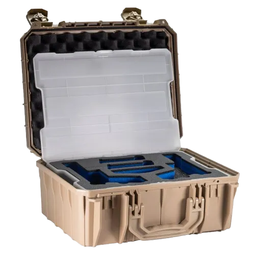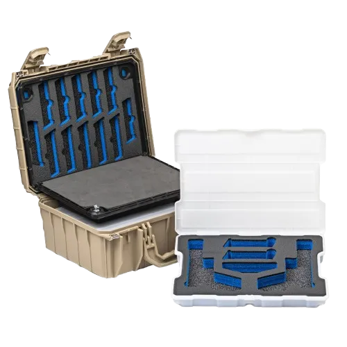 El estuche cuenta con tres bandejas internas apilables, cada una diseñada para alojar dos pistolas y dos cargadores, asegurados en espuma de celda cerrada precortada. Además, el estuche es resistente al agua, al polvo y a los impactos, ofreciendo una protección óptima para sus armas de fuego.
